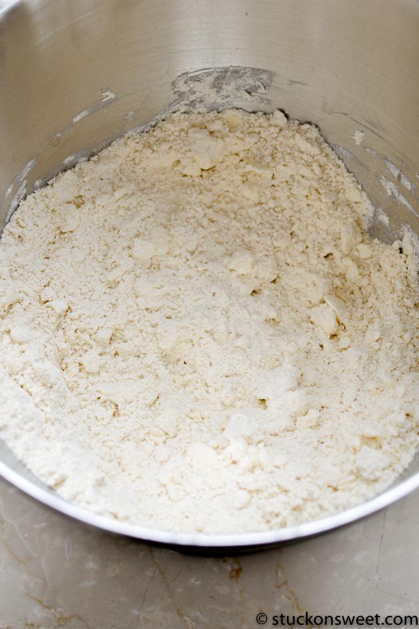 - In a stand-alone mixer fitted with a paddle attachment mix together the flour, salt, baking powder, and granulated sugar. Add cold cubed butter and mix on low-speed until course crumbs forms - careful not to over-mix. (see picture above for a visual)