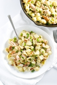 Salmon, Pea and Bacon Pasta is very simple to make and the ingredients are very straight forward. There are a ton of healthy nutrients in the salmon, like omega 3 fatty acids and protein and of course the peas are a green vegetable so they have to be healthy right?
